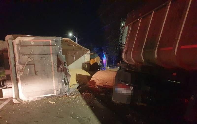 Pompierii au intervenit, noaptea trecută, la un eveniment rutier care s-a produs pe DN 24 C, în zona localității Santa Mare. Au fost implicate două tiruri. Unul dintre ele, încărcat cu cereale, s-a răsturnat, blocând circulația.