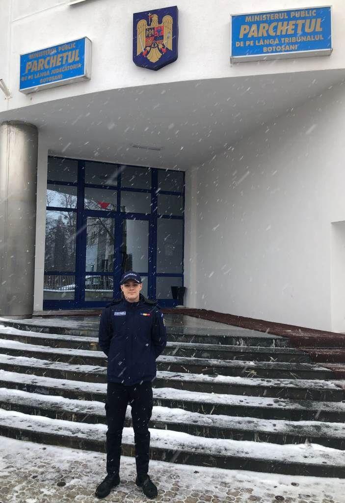 Ionuț este unul dintre cei 27 de elevi jandarmi aflați în practică la Jandarmeria Botoșani până la sfârșitul lunii februarie, în domeniul pazei și protecției instituționale.