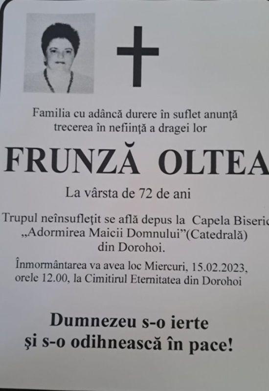 Colectivul de cadre didactice al Școlii gimnaziale „Mihail Sadoveanu” Dumbrăvița, regretă trecerea în veșnicie a distinsei profesoare FRUNZĂ OLTEA, din Dorohoi.
