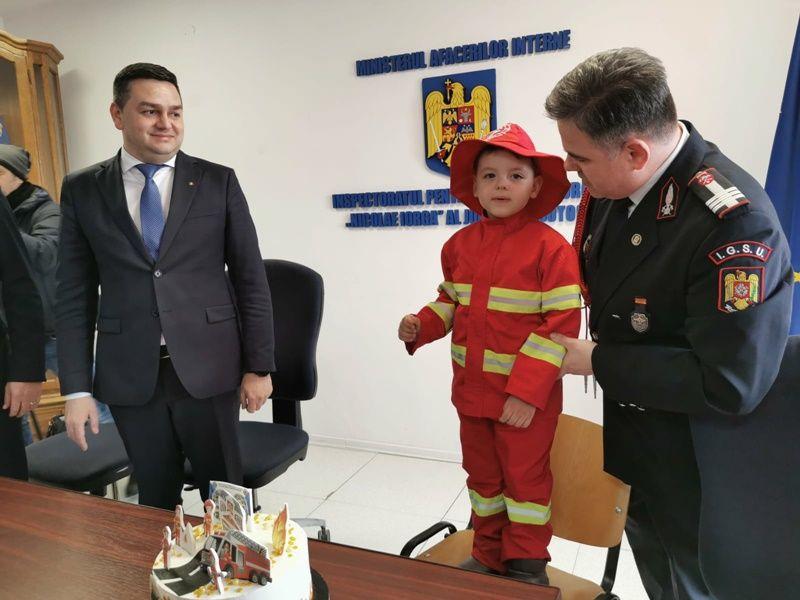 De departe, cel mai emoționant moment a fost surpriza oferită de un băiat, în vârstă de 3 ani. Matei este fascinat de pompieri și a dorit ca astăzi, de Ziua Protecției Civile, să le ofere eroilor lui un tort. A primit, în schimb, aplauze, îmbrățișări și o plimbare cu autospeciala de intervenție prin municipiul Botoșani.