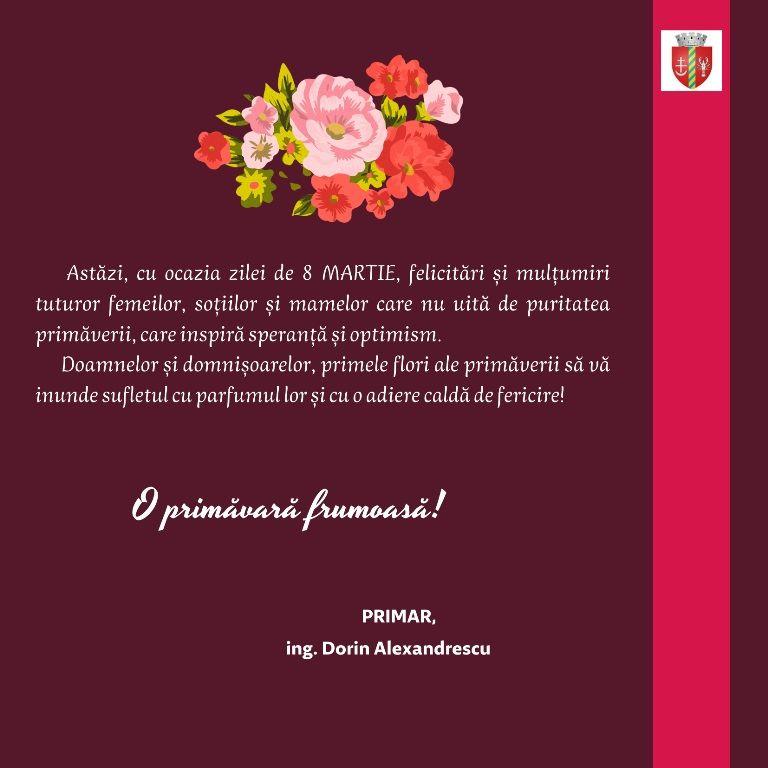 „Astăzi, cu ocazia zilei de 8 MARTIE, felicitări și mulțumiri tuturor femeilor, soțiilor și mamelor care nu uită de puritatea primăverii, care inspiră speranță și optimism.