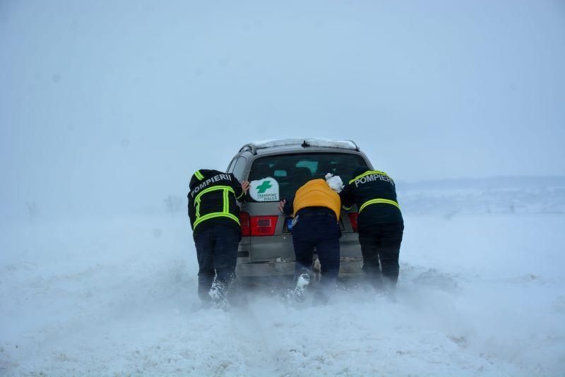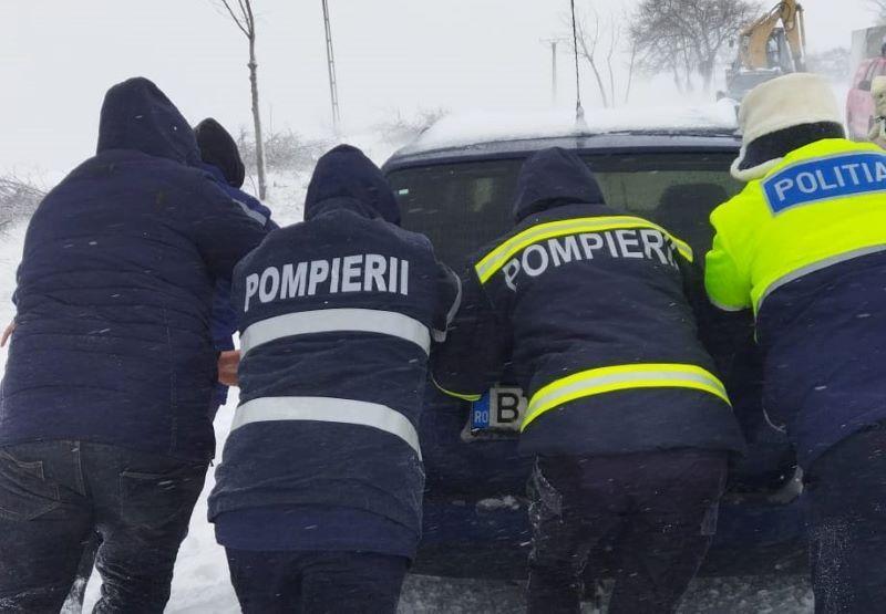 Totodată, pompierii aflați în monitorizare pe DN 29 la intersecția DJ 282 A, au intervenit pentru a scoate din zăpadă mai multe autoturisme, inclusiv o mașină care transporta persoane dializate, ramase înzăpezite.