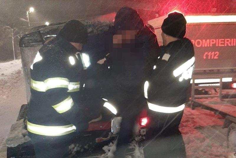 Pe raza localității Dumbrăvița, ambulanța care îl transporta a rămas înzăpezită.