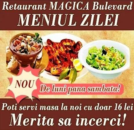 Dacă dorești să iei masa la noi, îți oferim meniul zilei cu doar 16 lei. Meniul zilei la MAGICA RESTAURANT BULEVARD din Dorohoi, constă în Felul 1 + Felul2 + Salată + desert. Te așteptăm cu un meniu bogat și proaspăt de fiecare dată. Merită să încerci!