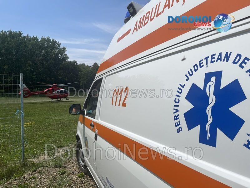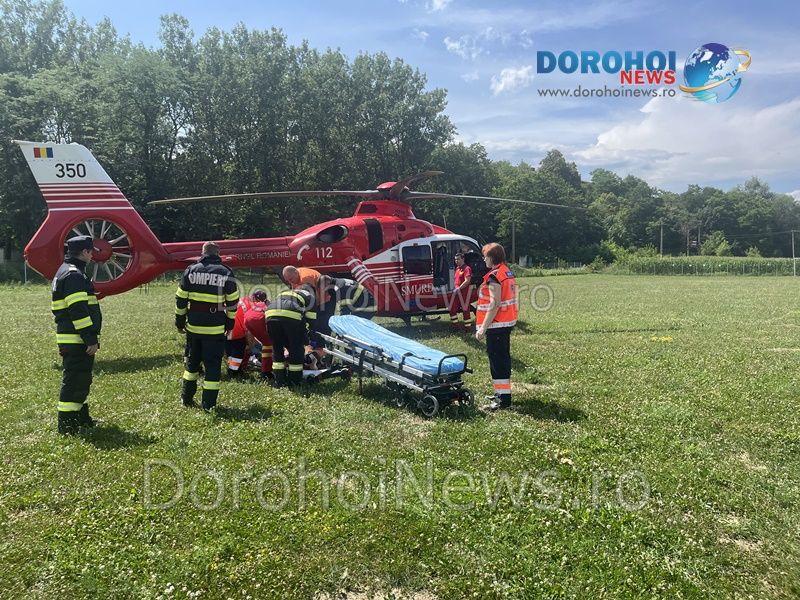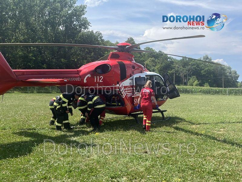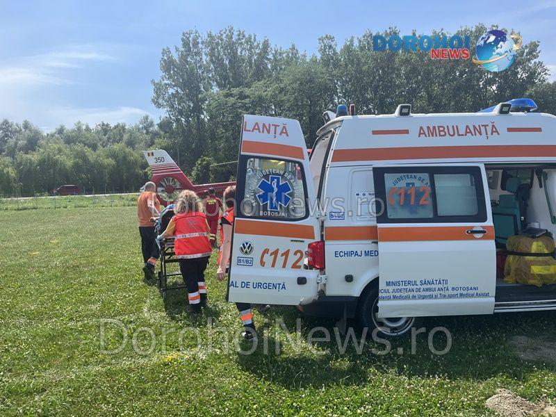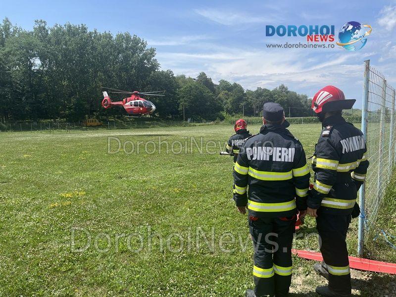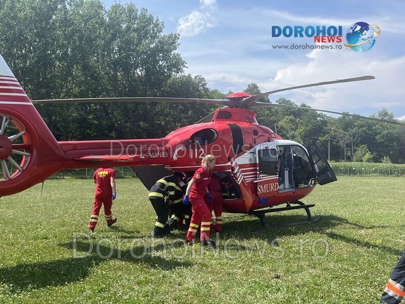 Elicopterul SMURD a fost solicitat joi, 20 iulie 2023, pentru a prelua o femeie, în vârstă de 54 de ani, din comuna Hudești.