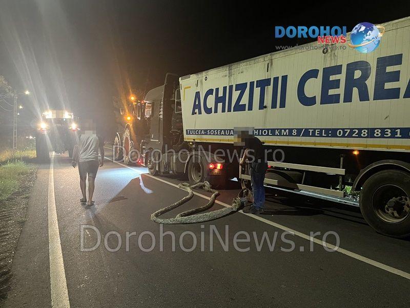 Un TIR plin cu cereale a ieșit în decor în seara zilei de miercuri, 23 august 2023, pe drumul național 29B Dorohoi-Botoșani, la ieșirea din Dorohoi.