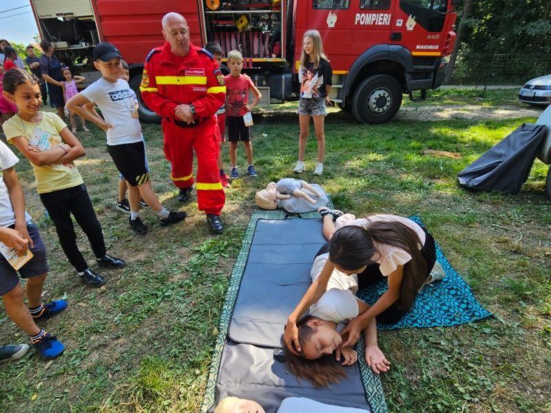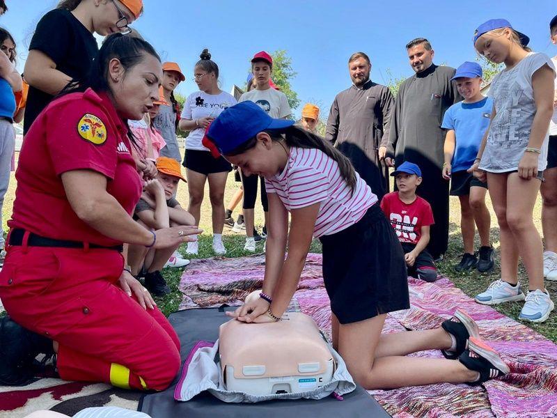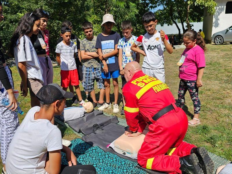 Simona Jitaru și Constantin Posteucă, voluntari în cadrul programului național "Salvator din Pasiune", i-au învățat cum să execute corect manevrele de acordare a primului ajutor, ce trebuie să facă dacă observă o persoană care se îneacă cu alimente și cum trebuie să asigure victima corect în poziția lateral de siguranță.
