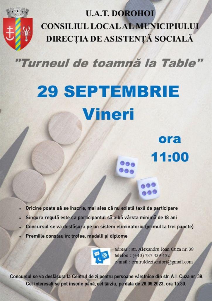 Cu ocazia zilelor Municipiului Dorohoi din anul 2023, comunitatea s-a adunat într-un spirit de competiție și camaraderie pentru un eveniment special – „Turneul de Toamnă la Table”. Acest eveniment a avut loc în data de 29 septembrie 2023, începând cu ora 11:00, la Centrul de Zi pentru Persoane Vârstnice, situat pe Strada A.I Cuza nr. 39. Cu o participare impresionantă de 22 de concurenți entuziaști, turneul a fost un adevărat spectacol al jocului de table. Evenimentul a adunat oameni de toate vârstele (începând cu vârsta de 18 ani), de la tineri pasionați de acest tip de joc la cei mai experimentați jucători din comunitate.