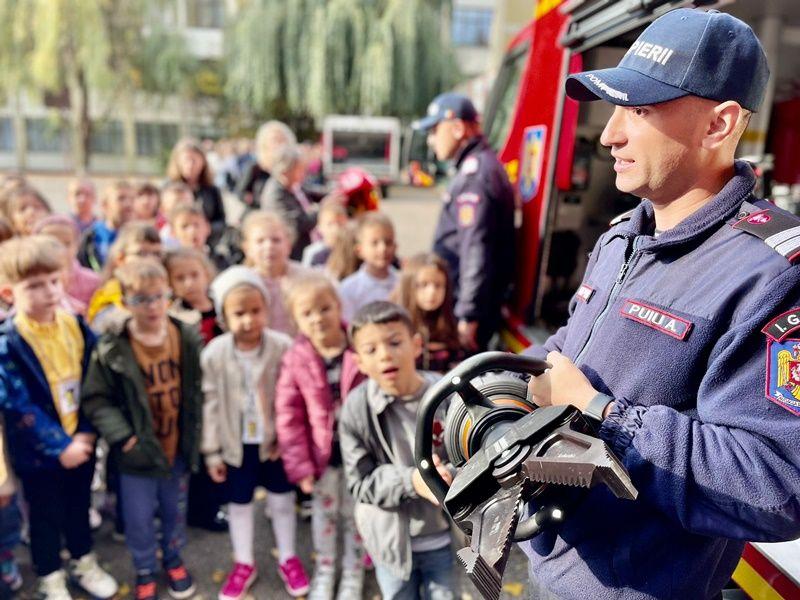 Copiii au aflat și în ce situații pompierii intervin cu autospeciala de stingere cu apă și spumă, dar și cum se folosește fiecare accesoriu.