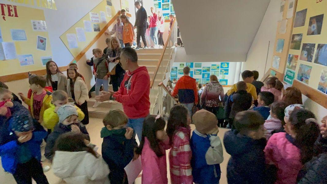 Însoțiți de învățători sau profesori, copiii au ieșit din sălile de clasă în momentul în care au auzit alarma și s-au adunat pe terenul de sport.