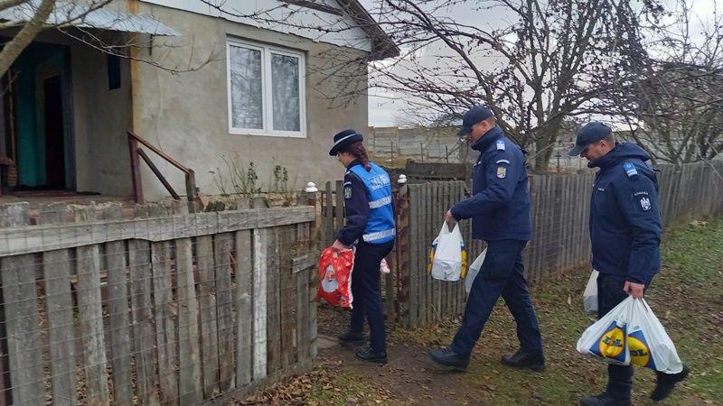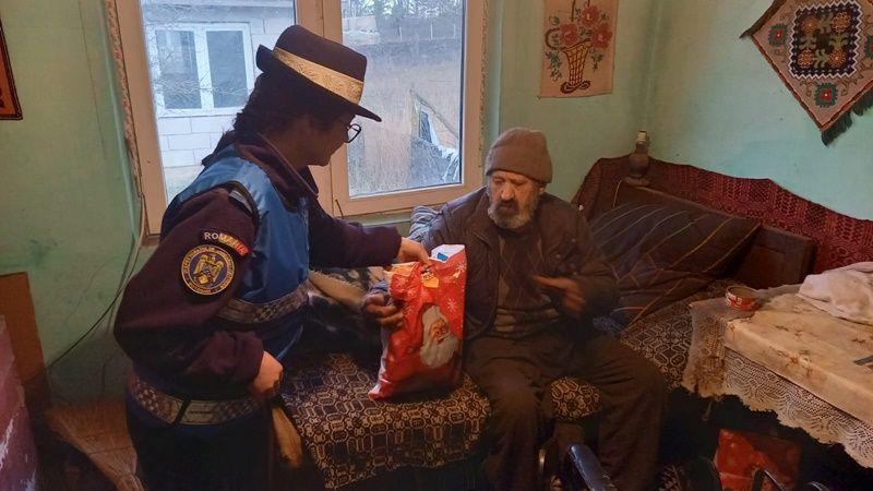 În această dimineață, a venit rândul jandarmilor să se asigure că nea Gheorghe din satul Crasnaleuca, comuna Coțușca, are suficiente bucate de pus pe masă, atât de Crăciun, cât și în perioada următoare.