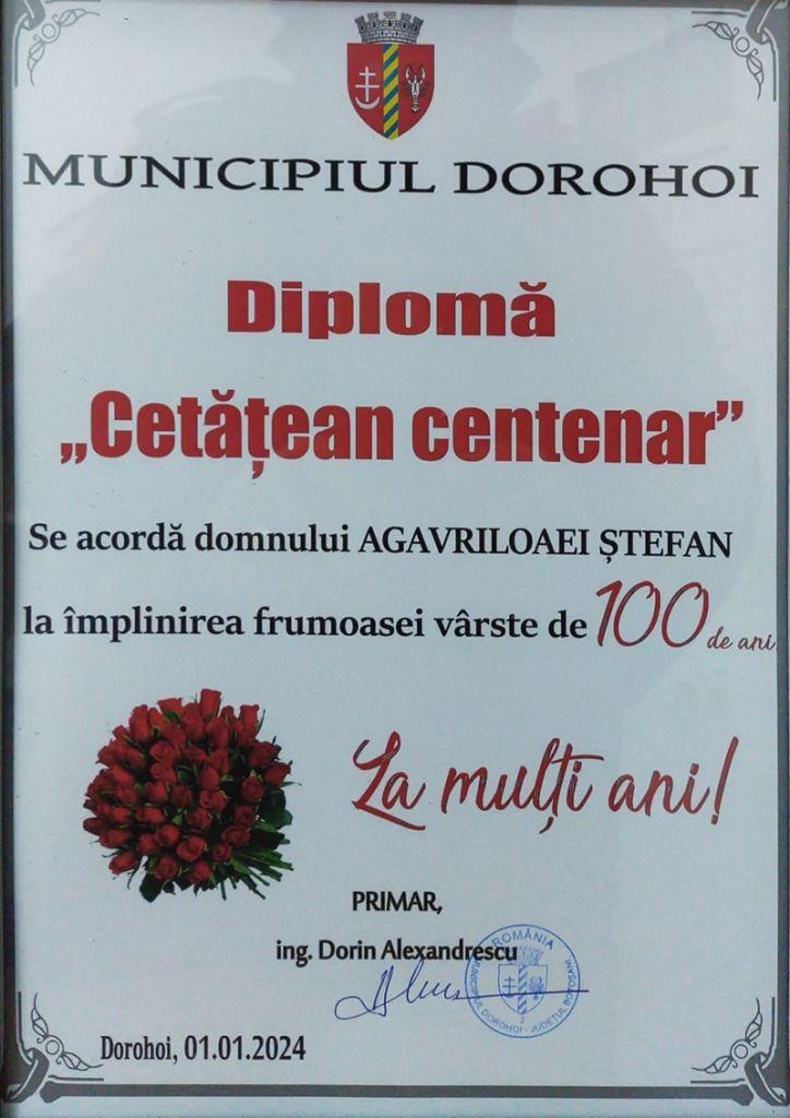 Primarul municipiului Dorohoi, Dorin Alexandrescu a acordat domnului Agavriloaei Ștefan diploma de „Cetățean centenar” la împlinirea vârstei de 100 de ani.
