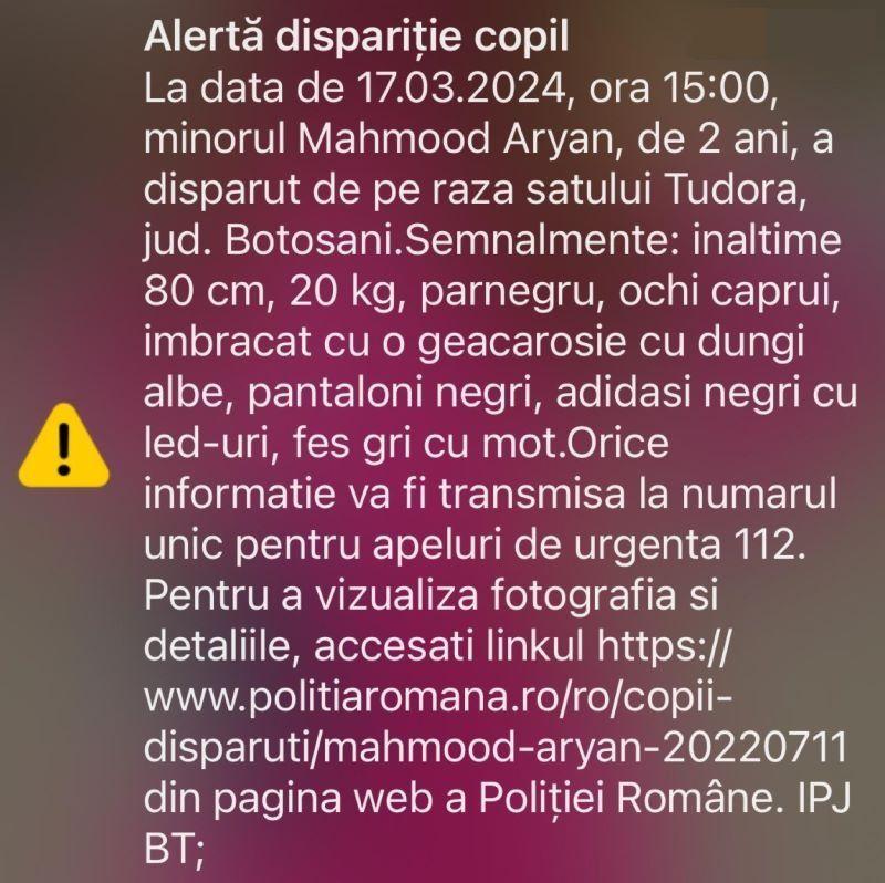 Comunitatea a fost mobilizată de polițiști pentru localizarea copilului dispărut, fiind transmis inclusiv mesaj ROAlert.