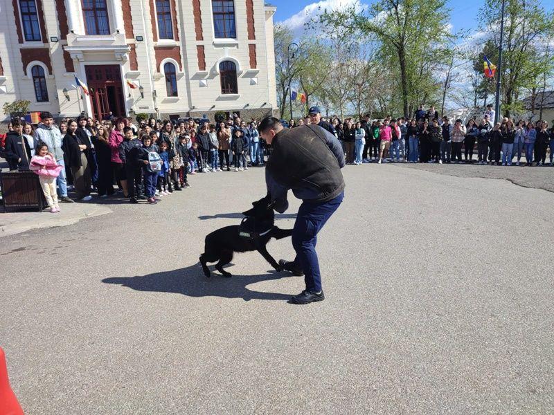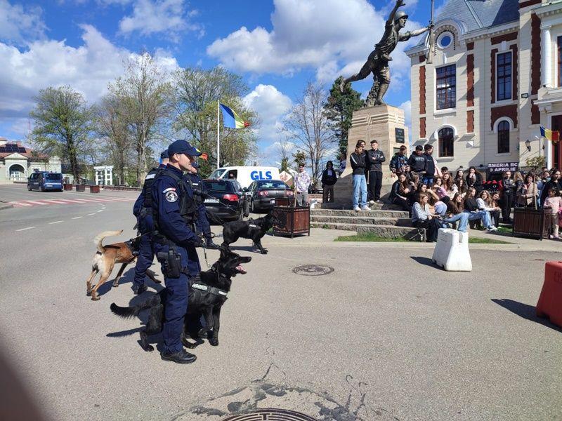 După finalizarea întâlnirii, elevii au putut urmări, pe esplanada Primăriei municipiului Dorohoi, exerciții de disciplină, dresaj canin și de intervenție pentru prinderea unui infractor care nu se supune somațiilor.
