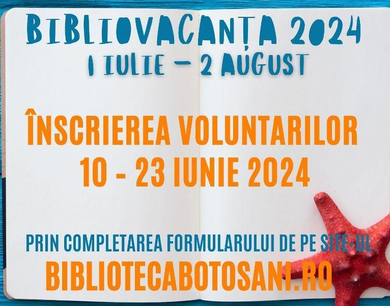 Biblioteca Județeană „Mihai Eminescu” Botoșani demarează înscrierile pentru Corpul de voluntari care vor susține cursuri în cadrul programului BiblioVacanța de anul acesta ce se va desfășura în perioada 1 iulie - 2 august 2024 (5 săptămâni).
