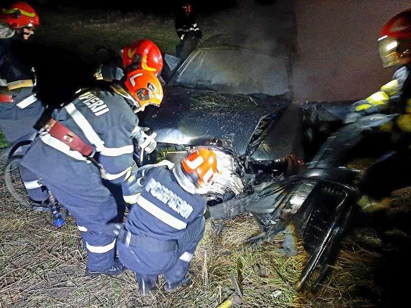 Un autoturism a luat foc după ce a lovit un copac de pe marginea unui drum din localitatea Ibănești, seara de 7 spre 8 octombrie 2024.