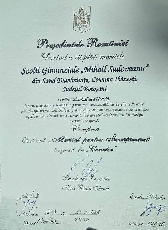 Într-un moment de mare mândrie pentru comunitatea din Ibănești, Președintele României, E.S. Domnul Klaus Werner Iohannis, a acordat una dintre cele mai prestigioase distincții Școlii Gimnaziale „Mihail Sadoveanu”. În cadrul unei ceremonii desfășurate la data de 8 octombrie 2024, instituția de învățământ a fost decorată cu Ordinul „Meritul pentru Învățământ”, în grad de „Cavaler”, prin Director, profesor Magopeț Mariana.