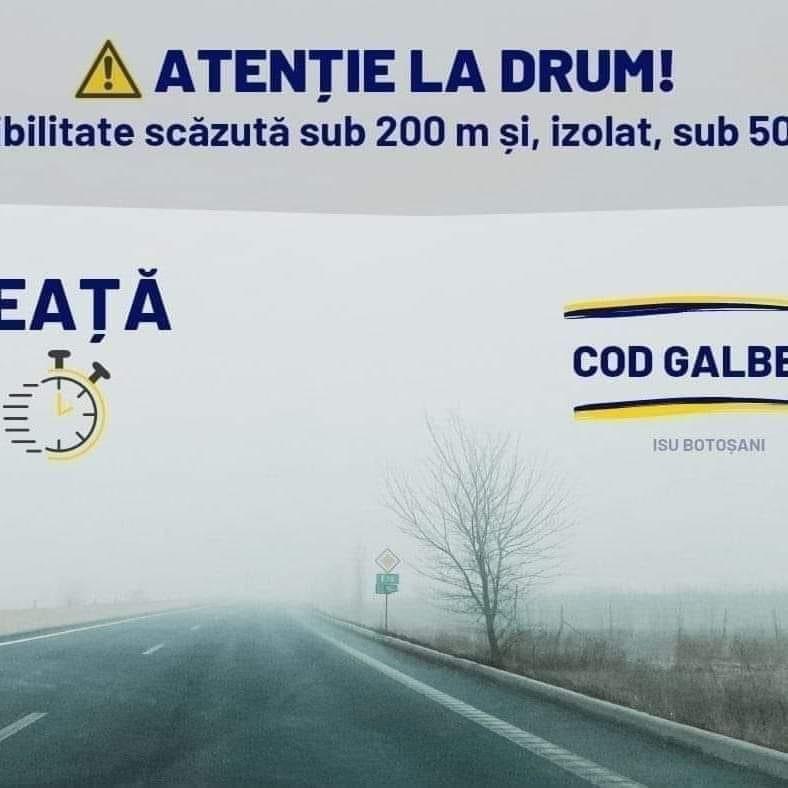 Din această cauză, pe drumurile din județ se va reduce vizibilitatea sub 200 de metri, izolat sub 50 de metri.