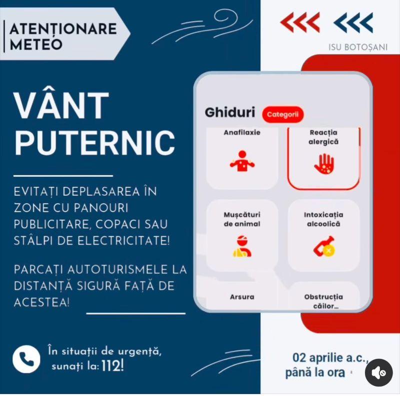 Meteorologii au actualizat prognoza și au emis o atenționare tip cod galben de instensificări ale vântului, pentru județul Botoșani. Aceasta este valabilă de luni ora 10:00, până marți seară, ora 21:00.