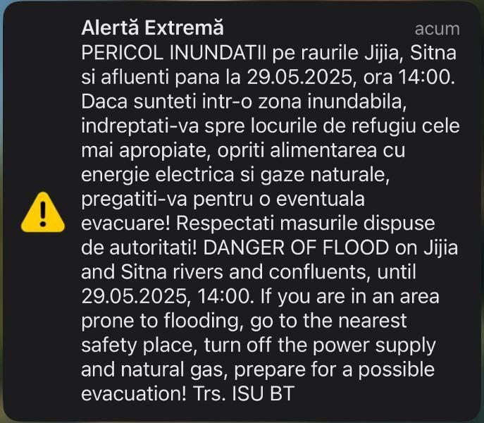 Dorohoienii au primit miercuri, 28 mai 2025, mesaj de alertă extremă privind pericolul de inundații pe râurile Jijia, Sitna și afluenții acestora până la data de 29 mai 2025, ora. 14