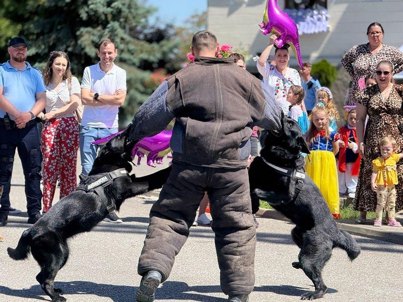 Exercițiile demonstrative de autoapărare și cele de disciplină și intervenție cu câinii de serviciu au adus zâmbete și au atras exclamații de bucurie din partea copiilor, dar și a părinților care îi însoțeau.