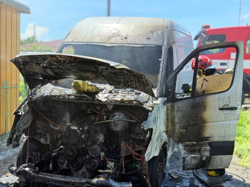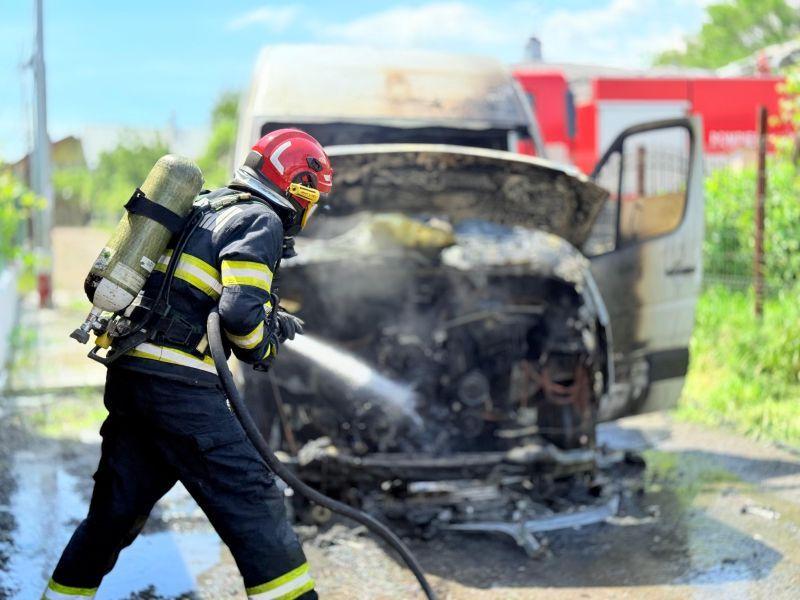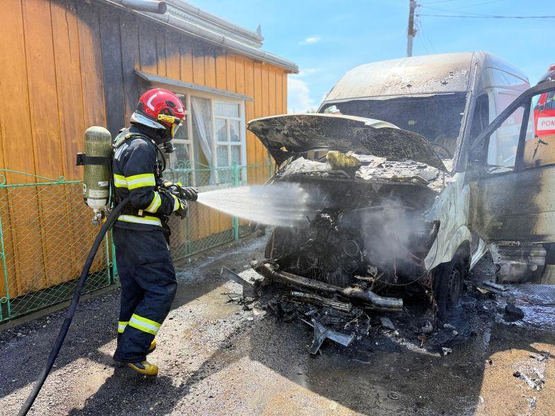Aceștia au constatat faptul că ardeau partea din față autoutilitarei, dar și aproximativ doi metri pătrați din peretele de scândură al unei case. Pompierii au acționat rapid astfel încât flăcările să nu se extindă. Din cauza căldurii emanate, a fost afectată și una dintre ferestrele locuinței.