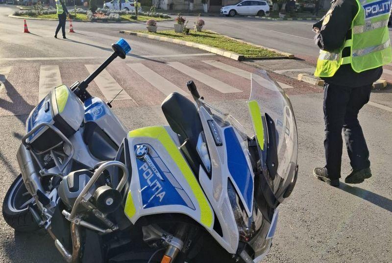 Din primele verificări a reieșit faptul că o tânără de 26 de ani, în timp ce se deplasa cu autoturismul pe strada Marchian, la schimbarea benzii de circulație ar fi acroșat motocicleta din dotarea Poliției.