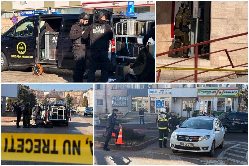 Din motive de siguranță, zona a fost evacuată, iar circulația rutieră a fost blocată pe străzile din apropierea sediului bancar, până la finalizarea verificărilor.
