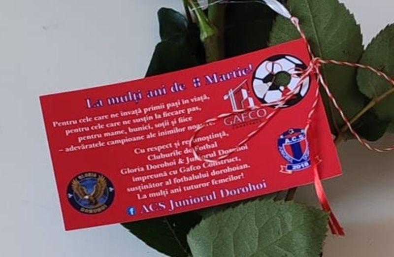 Jucătorii Cluburilor Juniorul și Gloria Dorohoi au ieșit în mijlocul comunității duminică, 8 Marie 2026, și au împărțit trandafiri doamnelor și domnișoarelor din municipiul Dorohoi, pentru a le aduce un zâmbet și un gând de apreciere.
