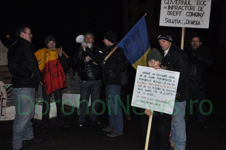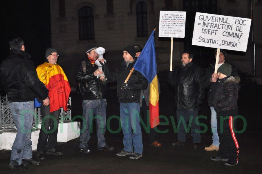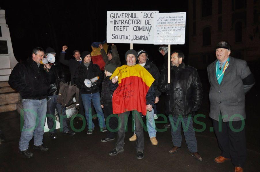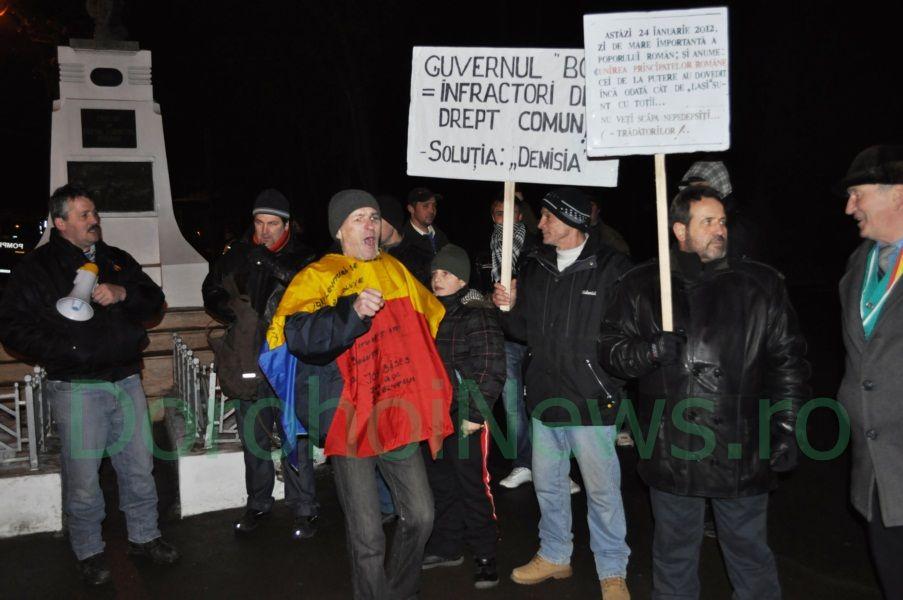Demonstranții au strigat sloganuri împotriva preşedintelui Traian Băsescu şi partidului de guvernământ. „Astăzi nu vrem să facem prea mare tam-tam, vrem să respectăm Ziua Unirii. Să ieșim pe stradă și să facem de râs un simbol a națiunii, e ușor, dar asta au făcut conducătorii noștrii până acum și nu cred că e cazul să o facem și noi. Eu personal voi continua protestele până când Băsescu își dă demisia”, a declarat pentru Dorohoi News, Nicu Anton, dorohoian care a fost prezent la toate mitingurile organizate în Dorohoi.