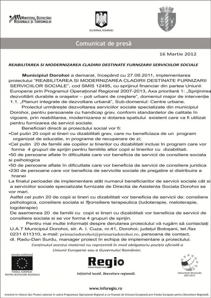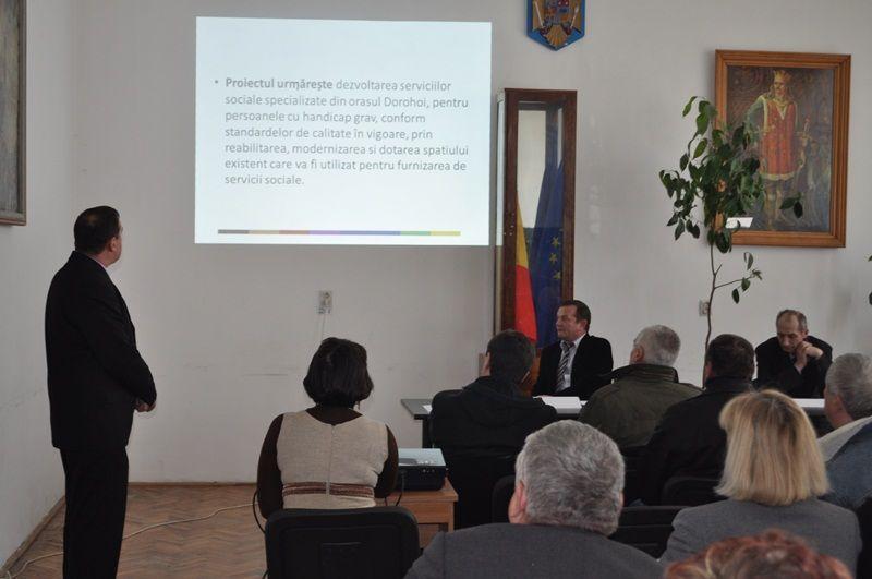 La conferinţă s-a prezentat Proiectul „REABILITAREA ȘI MODERNIZAREA URBANĂ A MUNICIPIULUI DOROHOI” şi Proiectul „REABILITAREA ŞI MODERNIZAREA CLĂDIRII DESTINATE FURNIZĂRII SERVICIILOR SOCIALE” care este parte componentă a acestuia.