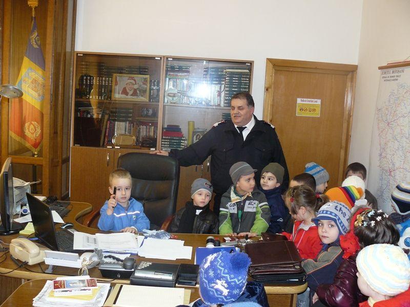În biroul inspectorului şef, punctul de atracţie l-a constituit scaunul acestuia. Fiecare dintre preşcolarii Grădiniţei nr. 14 a fost pentru câteva minute inspector şef. Ipostaza de şef i-a încântat cel mai mult.