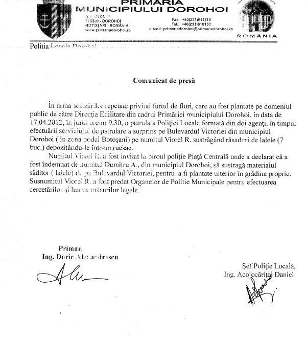 În dimineaţa zilei de astăzi, 17 aprilie, Poliţia Locala a municipiului Dorohoi a fost sesizată de câţiva cetăţeni cu privire la faptul ca o persoana sustrage lalele de pe Bulevardul Victoriei.