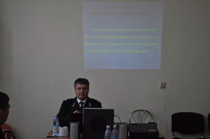 La Casa de Cultură a municipiului Dorohoi, în ziua de 24.04.2012, Inspectoratul pentru Situaţii de Urgenţă „N. Iorga” al judeţului Botoşani a început instructajul anual de pregătire cu primarii, în calitatea lor de preşedinţi ai comitetelor locale pentru situaţii de urgenţă din localităţile: Dorohoi, Broscăuţi, Corlăteni, Cordăreni, Dersca, Dimăcheni, Hilişeu-Horia, Ibăneşti, Lozna, Mihăileni, Pomârla, Şendriceni şi George Enescu, instructaj care a avut ca obiectiv perfecţionarea cunoştinţelor şi deprinderilor pentru planificarea, conducerea, desfăşurarea şi evaluarea activităţilor de prevenire, protecţie şi intervenţie în domeniul situaţiilor de urgenţă determinate de riscurile specifice localităţilor precum şi eficientizarea activităţii de management al situaţiilor de urgenţă prin constituirea şi operaţionalizarea unor structuri adecvate, intensificarea pregătirii şi informării preventive şi promovarea voluntariatului şi a experienţei pozitive în domeniu.