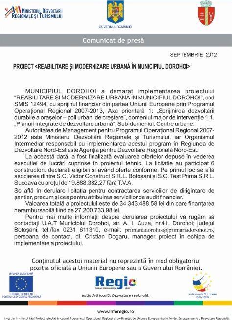 Totodată primarul municipiului Dorohoi, Dorin Alexandrescu, a mai informat și asupra faptului că Proiectul „REABILITAREA ȘI MODERNIZAREA URBANĂ A MUNICIPIULUI DOROHOI” este aproape de stadiul începerii lucrărilor, contractul putând fi semnat la începutul săptămânii viitoare în cazul în care nu vor exista contestații. (Andrei B.)