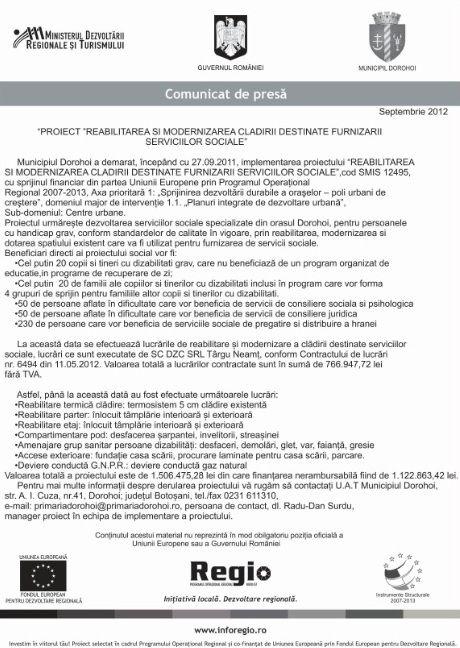 La conferinţă s-a prezentat stadiul Proiectului „REABILITAREA ȘI MODERNIZAREA URBANĂ A MUNICIPIULUI DOROHOI” şi a Proiectului „REABILITAREA ŞI MODERNIZAREA CLĂDIRII DESTINATE FURNIZĂRII SERVICIILOR SOCIALE” care este parte componentă a acestuia.