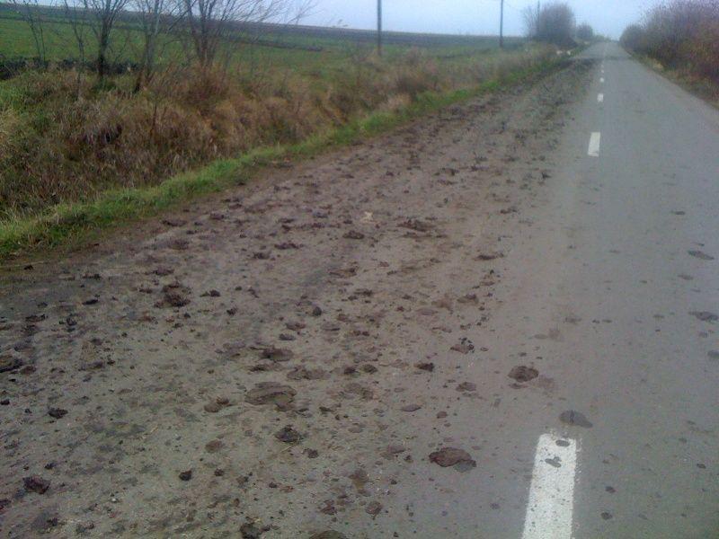 Ploile căzute în ultima perioadă au determinat formarea unor pojghiţe de noroi pe terenurile agricole care se depune pe roţile tractoarelor sau a altor utilaje agricole. În momentul când acestea intră pe drumuri, noroiul depus pe roţi se desprinde şi se aşează pe asfalt. Astfel de urme de noroi pot fi văzute pe aproape toate drumurile din judeţ la intersecţia acestora cu drumurile de acces la terenurile agricole.