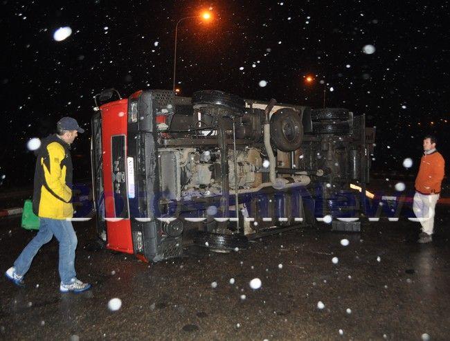 Un camion încărcat cu carne s-a răsturnat, luni seară, în sensul giratoriu de pe strada Sucevei, la intersecţia cu strada Pacea. Maşina venea dinspre Cătămărăşti Deal, unde a fost încărcată cu carne (carcasă de bovină) de la abatorul C & C Company, şi se îndrepta spre Ploieşti.
