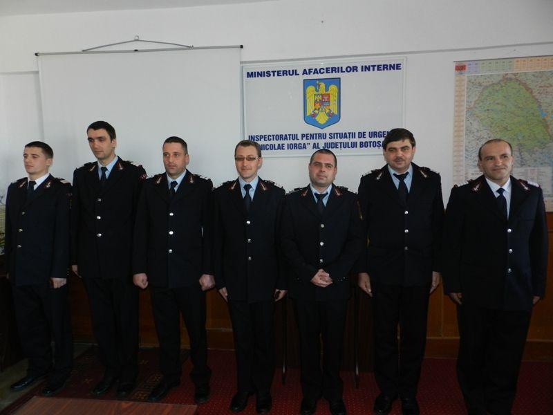 Şapte salvatori de la Inspectoratul pentru Situaţii de Urgenţă „Nicolae Iorga” al Judeţului Botoşani au fost înaintaţi în grad, înainte de expirarea stagiului minim, cu ocazia „Zilei Protecţiei Civile din România”. Este vorba de şapte subofiţeri care s-au remarcat prin modul exemplar în care şi-au îndeplinit atribuţiile de serviciu.