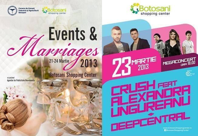 În perioada 21-24 martie Camera de Comerț, Industrie și Agricultură Botoșani în parteneriat cu Botoşani Shopping Center, organizează prima ediție a târgului de nunți și evenimente EVENTS & MARRIAGES BOTOȘANI 2013. Manifestarea este un eveniment de referință dedicat prezentării de rochii de mireasă și costume pentru miri, bijuterii, aranjamente florale și locatie de evenimente.