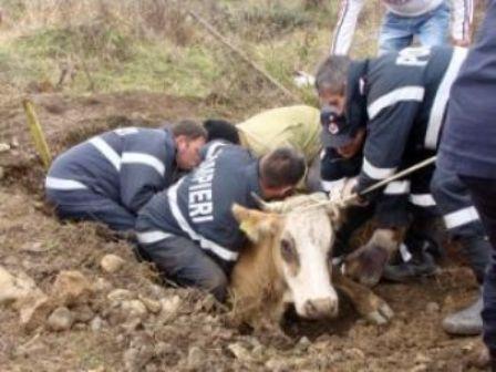 La faţa locului s-a deplasat un echipaj din cadrul Gărzii de Intervenţie Ştefăneşti. Pompierii au legat bovina cu mai multe furtunuri şi cu ajutorul unui utilaj au reuşit să o scoată din captivitate.