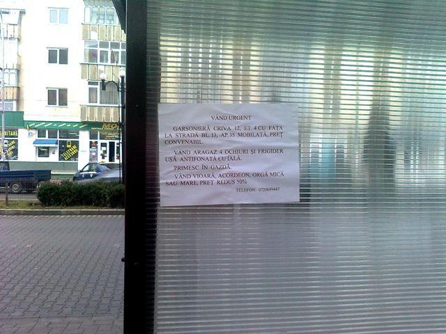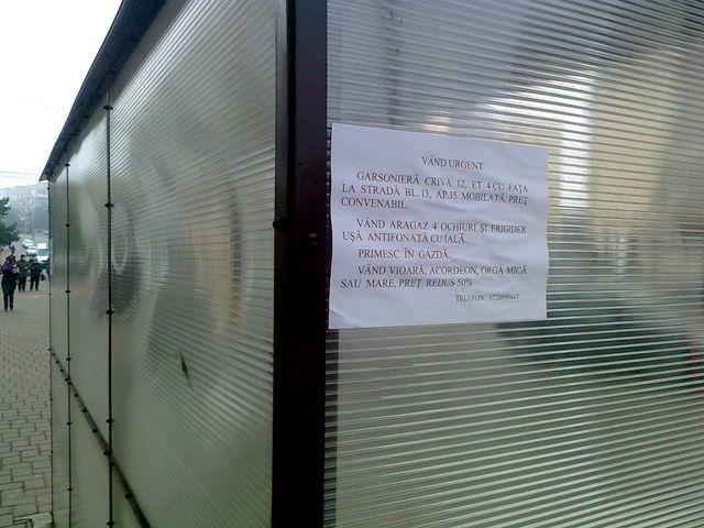 „Pentru cei care, folosesc mijlocul de transport local VIP, dar şi pentru dorohoieni, în general, acele locuri de adăpost nou construite în staţii, sunt de o mare şi benefică utilitate. Cei ce aşteaptă microbuzul, sunt şi vor fi feriţi de ploaie, vânt sau soarelele arzător (pe timpul verii). Este bine că primăria a investit şi cetăţeanul are un adăpost, un loc de refugiu. Mă gândeam… cât o să dureze până se vor degrada, până pereţii din PVC vor deveni loc de afişaj ? Normal ar fi, ca amplasarea afişelor sau anunţurilor să se facă în locuri special prevăzute de autorităţile administraţiei publice locale. Iată că, stâlpii de iluminat public nu mai sunt utili pentru astfel de afişe şi precedentul a fost creat de un cetățean din Dorohoi care îşi vinde garsoniera mobilată, aragazul, frigiderul şi uşa, primeşte şi în gazda dar a scos la vânzare vioara, acordeonul şi orgile (o fi un „greieraş” care a cântat toată vara – desprins din fabula binecunoscută). Nu o să dureze mult până când şi alţi „comercianţi” îşi vor posta diferitele anunţuri în aceste locuri, esteticul stradal devenind inestetic. Cine plăteşte oamenii care vor îndepărta aceste afişe şi adezivul cu care au fost lipite ? Primăria ? Sau noi, cetățenii din Dorohoi?”