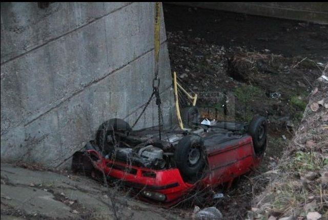 Doi tineri în vârstă de 23 de ani şi o femeie în vârstă de 45 de ani, care se aflau într-un autoturism VW Golf, au zburat cu maşina peste podul de la ieşirea din municipiul Suceava spre Şcheia, în valea care coboară dinspre Calea Obcinelor. Accidentul s-a produs astăzi dimineață, în jurul orei 6:00.