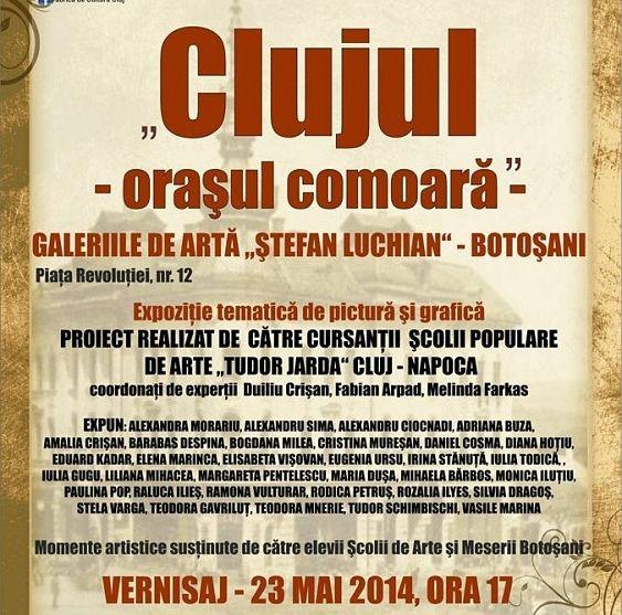 Consiliul Judeţean Botoşani, Consiliul Judeţean Cluj, Şcoala Populară de Arte şi Meserii Botoşani, Şcoala Populară de Arte „Tudor Jarda” Cluj-Napoca, Muzeul Judeţean Botoşani, vă invită în data de 23 mai 2014, ora 17, să participaţi la vernisajul expoziţiei „Clujul – oraşul comoară” în Galeriile de Artă „Ştefan Luchian”, Piaţa Revoluţiei, nr. 12, Botoşani.