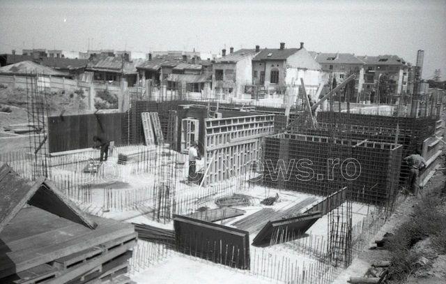 Aceste fotografii, nu pot să ne trezească amintiri, nu putem să ne amintim de ceva ce nu a fost finalizat, iar, dacă până acum, în articolele precedente v-am arătat cum a fost oraşul în trecut...acum dorim să ne imaginăm cum trebuia să fie. Categoric, clădirile vechi demolate din centrul oraşului au fost înlocuite de această mega-temelie, care, acum, după aproximativ 20 de ani, ne reprezintă cu “cinste”, fiindu-ne martoră tăcută la diferitele evenimente care au loc în centrul oraşului – Zilele Oraşului, Ziua Copilului, Târgul Meşteşugarilor, Festivalul de Teatru, Festivalul Mugurelul. Distingem în fundal, doi “străjeri”, două macarale. Una pentru construcţia care trebuia să devină Banca Dacia Felix – preluată apoi de actualul ANAF – şi cealaltă dintre macarale, care a ridicat actualul CEC.