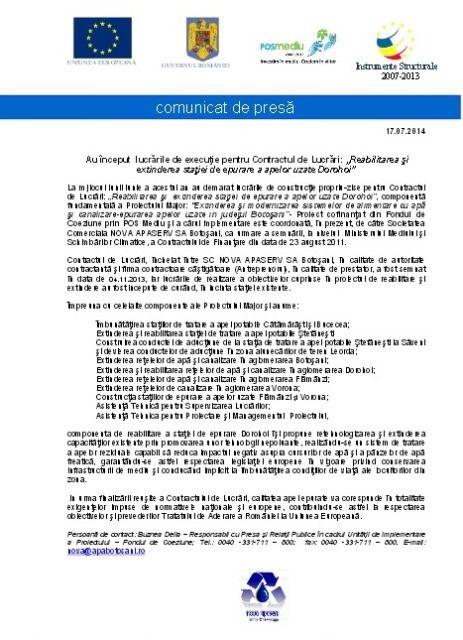 La mijlocul lunii iunie a acestui an au demarat lucrările de construcţie propriu-zise pentru Contractul de Lucrări: „Reabilitarea şi extinderea staţiei de epurare a apelor uzate Dorohoi”, componentă fundamentală a Proiectului Major: “Extinderea şi modernizarea sistemelor de alimentare cu apă şi canalizare-epurarea apelor uzate in judeţul Botoşani”- Proiect cofinanţat din Fondul de Coeziune prin POS Mediu şi a cărui implementare este coordonată, în prezent, de către Societatea Comerciala NOVA APASERV SA Botoşani, ca urmare a semnării, la nivelul Ministerului Mediului şi Schimbărilor Climatice, a Contractului de Finanţare din data de 23 august 2011.