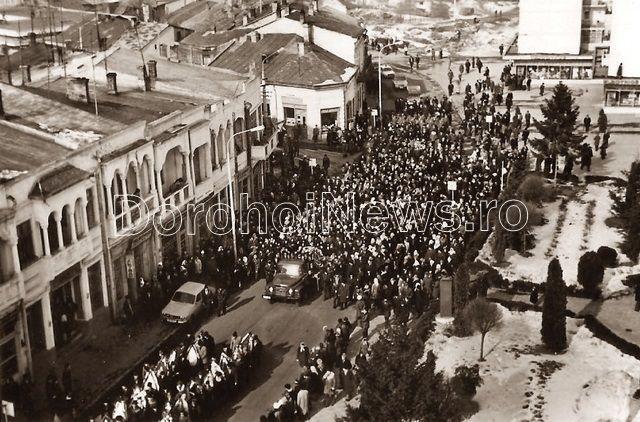 În urma demersului nostru, prin care, prof. Ilarion Mandachi, Roşca Velea Alexandru şi Marius Petrescu, căutam fotografii, vederi, cărţi poştale, cu aspecte ale trecutului istoric al Dorohoiului, ca urmare a campaniei de reconstituire a istoriei oraşului, prin fotografie -“Dorohoiul de altădată”, au fost “recuperate” trei imagini care au legătură cu subiectul menţionat mai sus. Astfel, cu sprijinul redacţiei Dorohoi News, suportul media al acestei acţiuni, dorim să arătăm dorohoienilor, în una dintre aceste imagini, aspecte cu convoiul mortuar, fotografie surprinsă înainte de anii ’80 de la unul dintre balcoanele Blocului Turn, când sute de dorohoieni, l-au condus pe ultimul drum, pe directorul IJPIPS – d-nul Frunză, cel care odihneşte la câţiva metri de poarta cimitirului, pe aleea principală, mormântul acestuia fiind placat cu marmură neagră.
