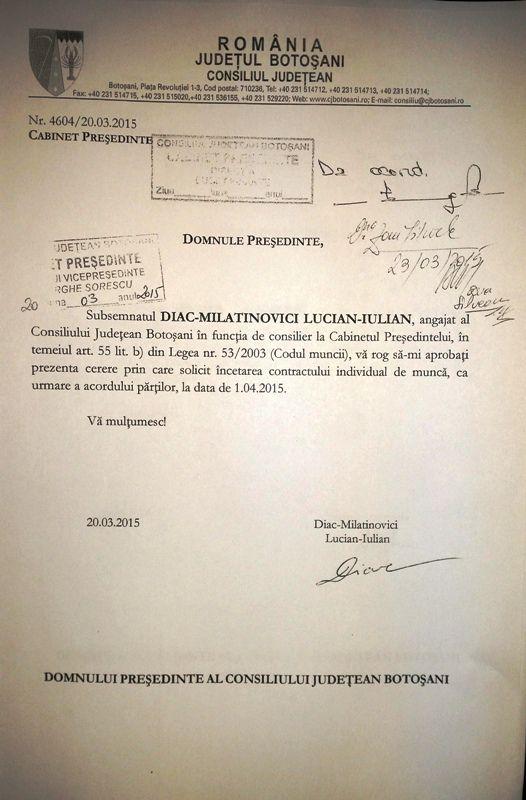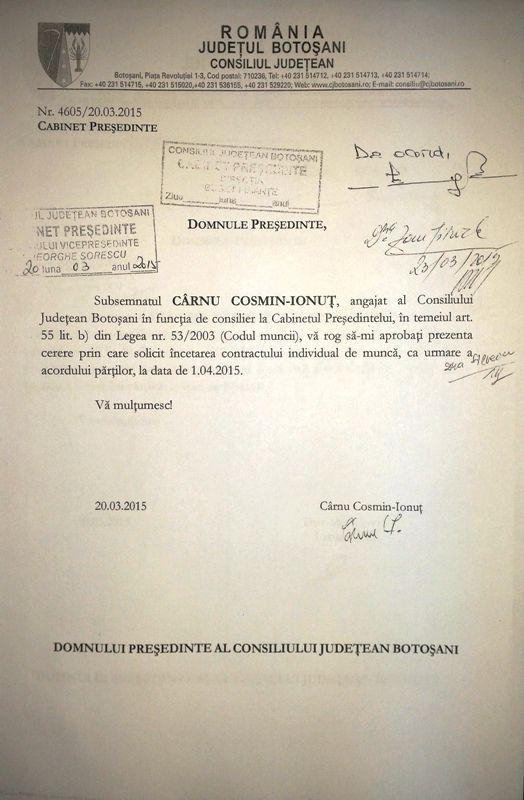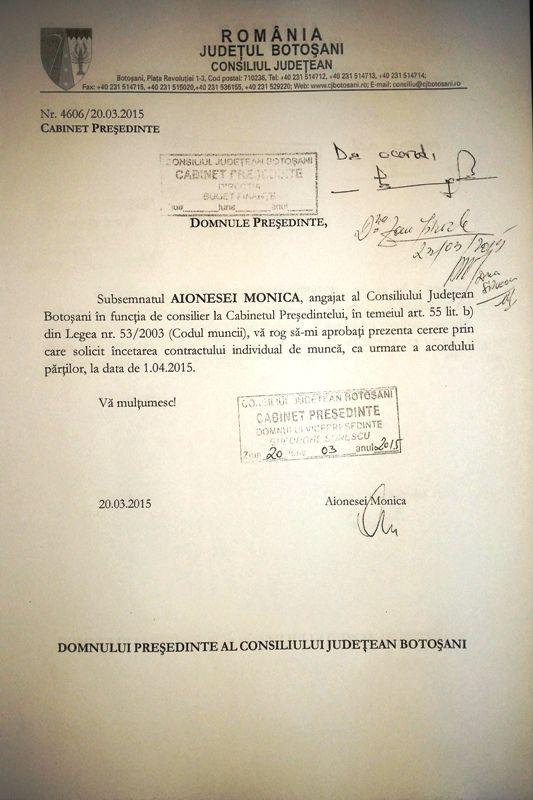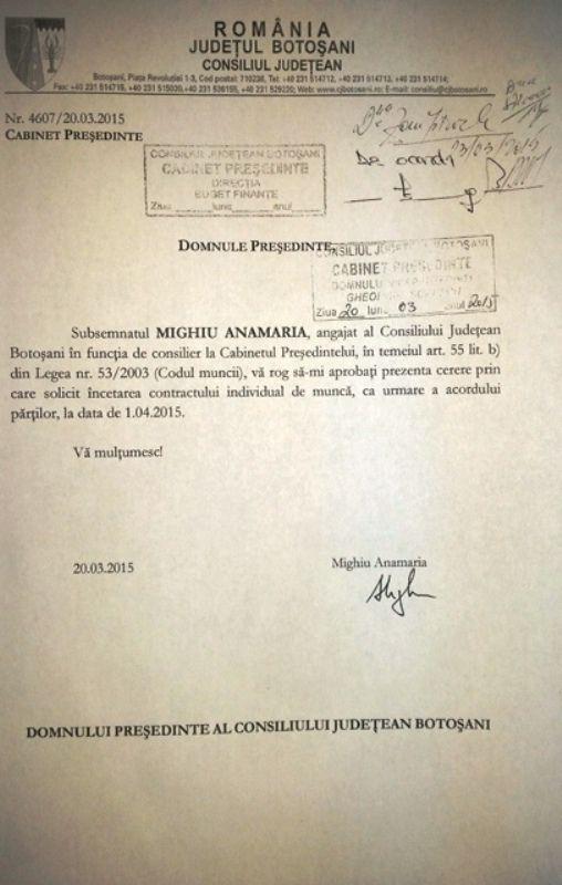 Având în vedere că mandatul președintelui Consiliului Județean Botoșani, Florin Țurcanu, a încetat în urma ordinului emis de Prefectul Județului, respectiv a hotărârii definitive a Tribunalului Botoșani, cei patru consilieri de la Cabinet și-au depus, în cursul zilei de vineri, 20 martie 2015, cererile de încetare a raporturilor de muncă cu acordul părților începând cu data de 1 aprilie 2015.