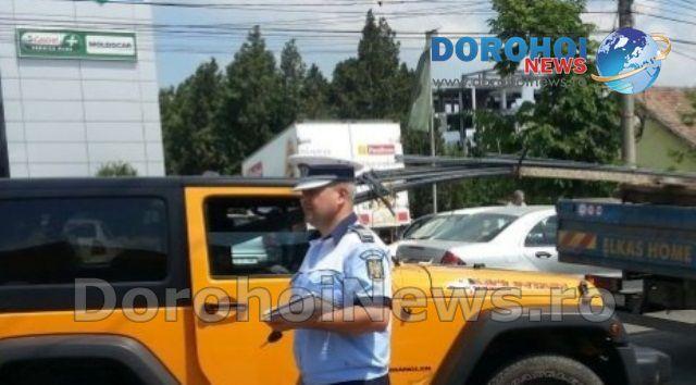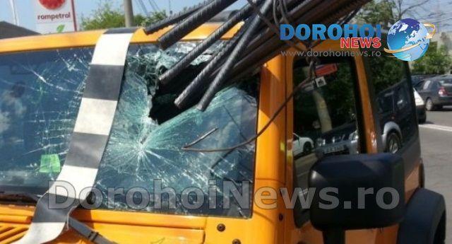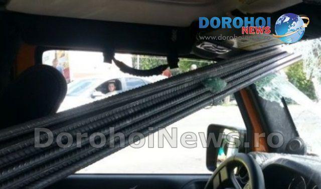 Soferul camionului stationa regulamentar la semafor, iar barele metalice iesite din aria remorcii au strapuns parbrizul masinii, acesta ajungand tocmai in partea dreapta-spate a autoturismului de teren.