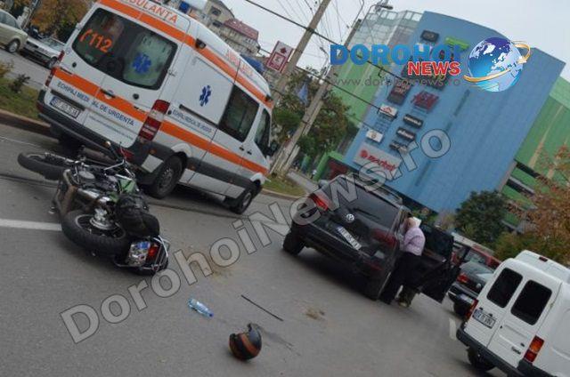 Accident în apropiere de Uvertura Mall. Un bărbat care se afla pe o motocicletă Honda s-a izbit puternic într-un VW Touareg și a rămas pe asfalt, fără cunoștință.